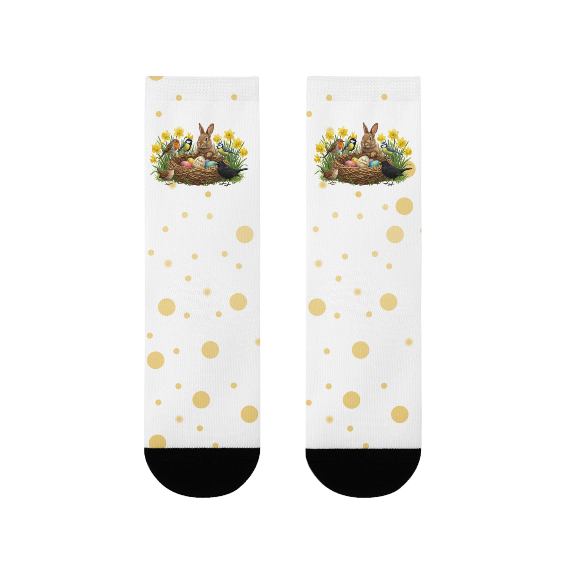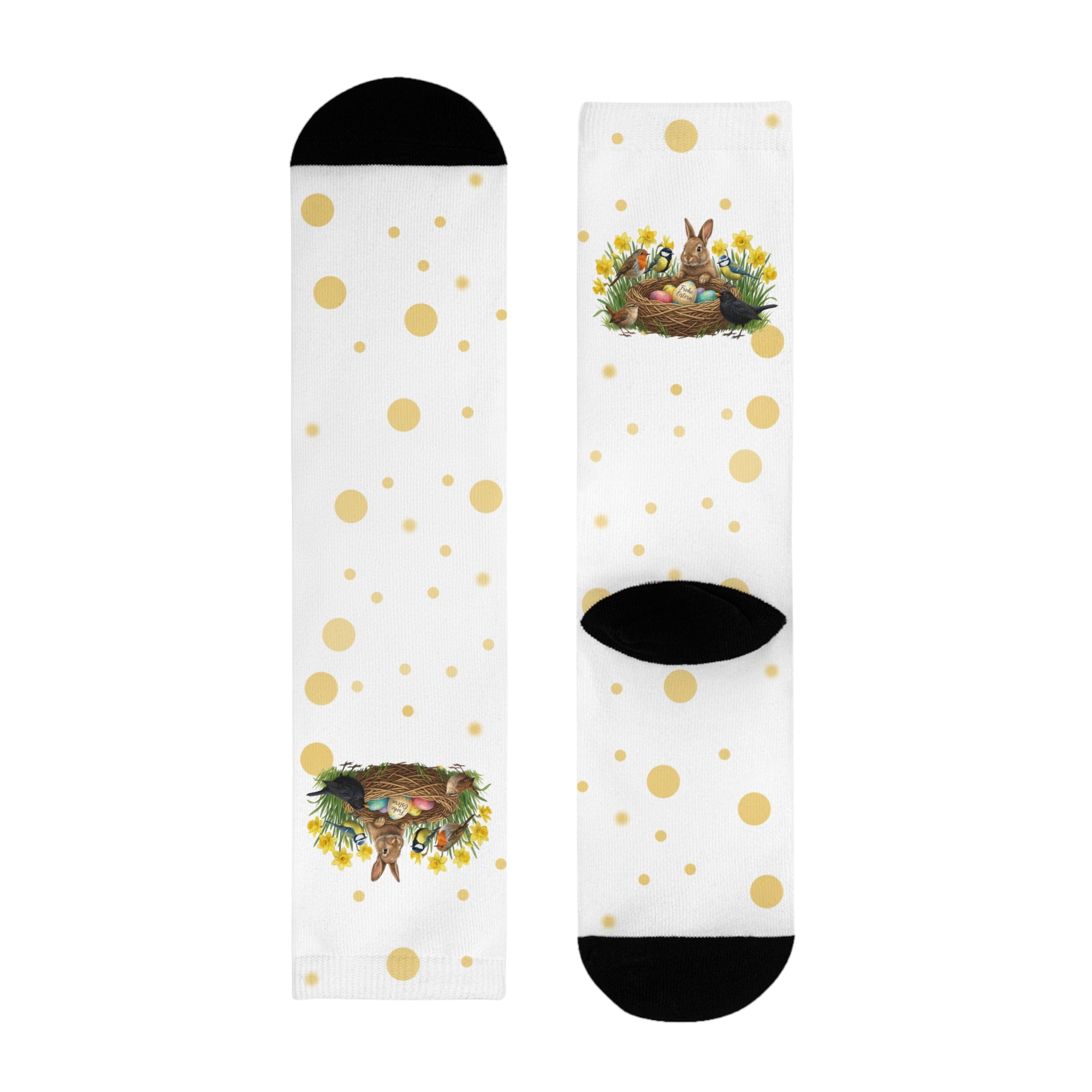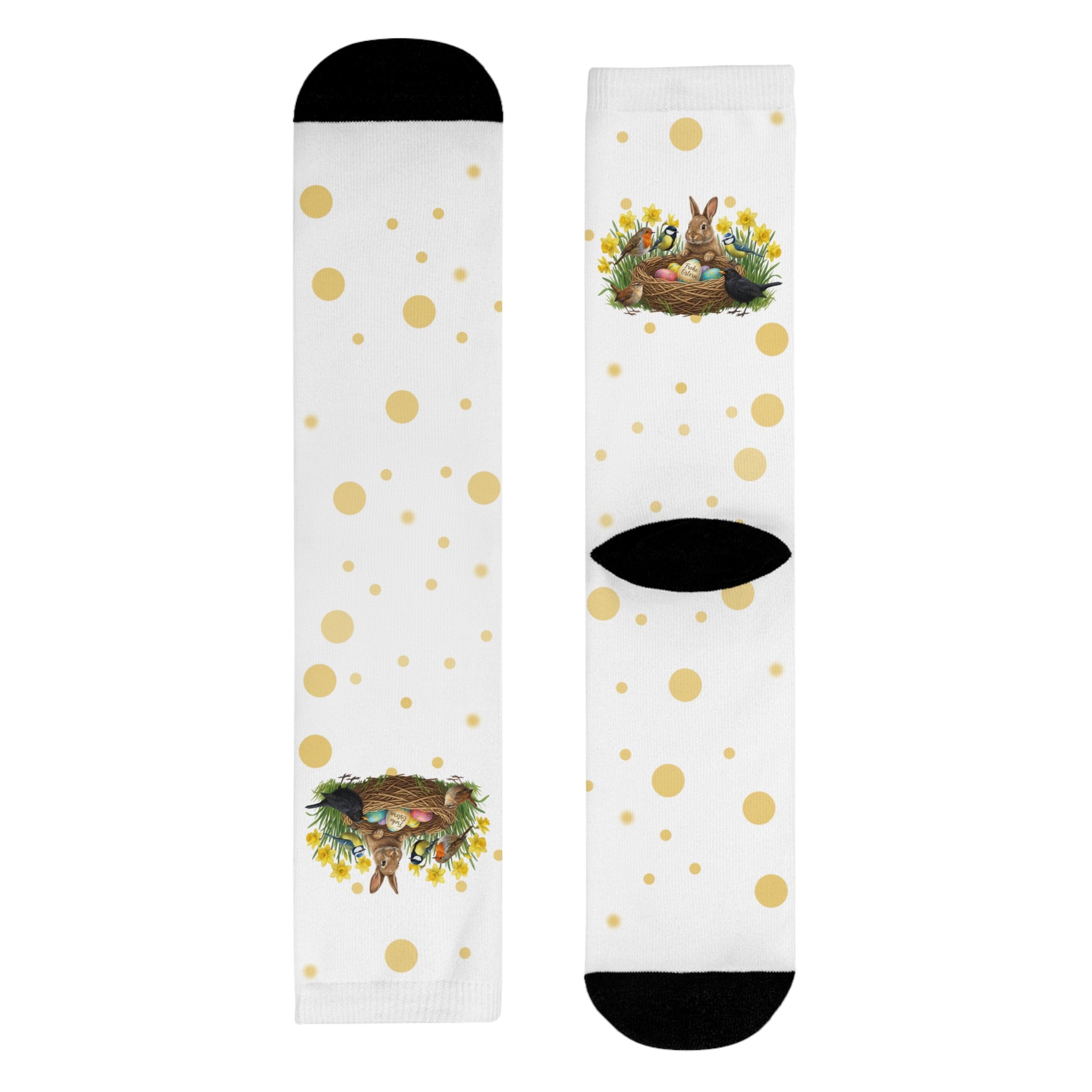 Sind deine Füße bereit für den Frühling? Mit diesen farbenfrohen Vogel-Socken trägst du die gute Laune bei jedem Schritt mit dir. Das rundum bedruckte Design zeigt ein friedliches Kaninchen im Osterglocken-Beet, besucht von unseren liebsten gefiederten Freunden: Amsel, Rotkehlchen, Blaumeise, Kohlmeise und Zaunkönig.