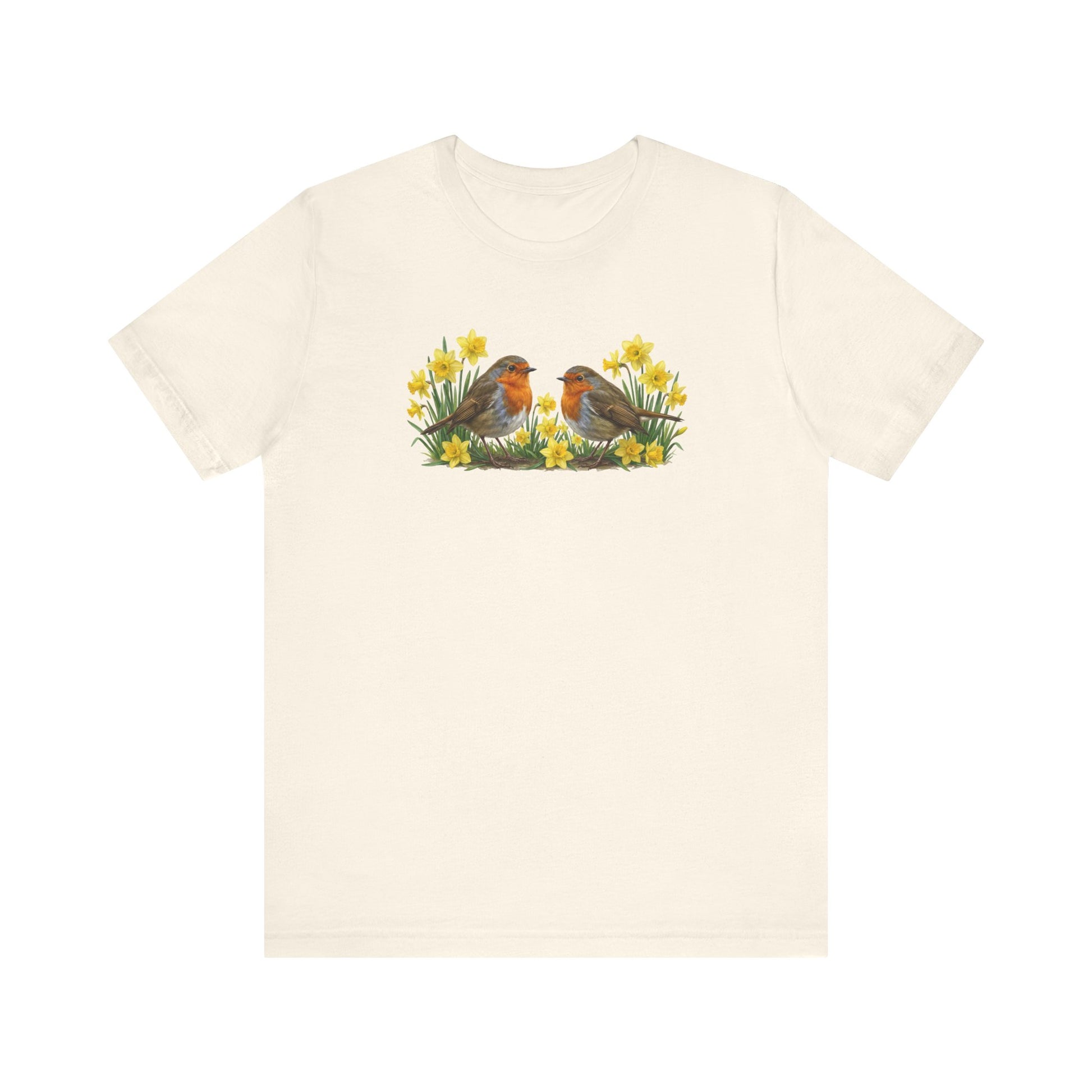 Oster T-Shirt Rotkehlchen in Osterglocken | Premium Baumwolle | Geschenk für Vogelfreunde