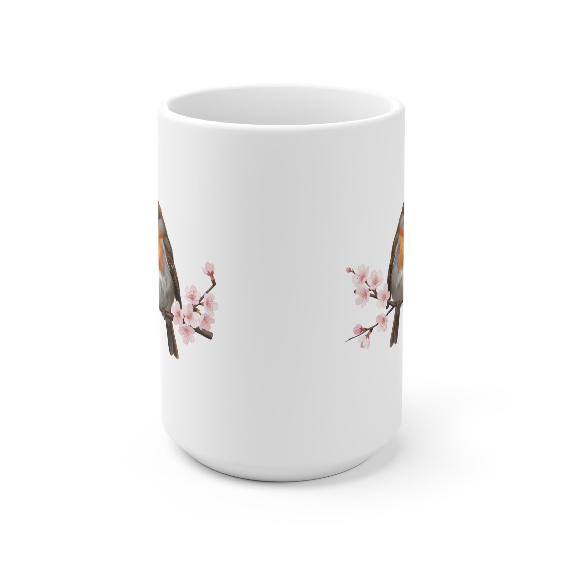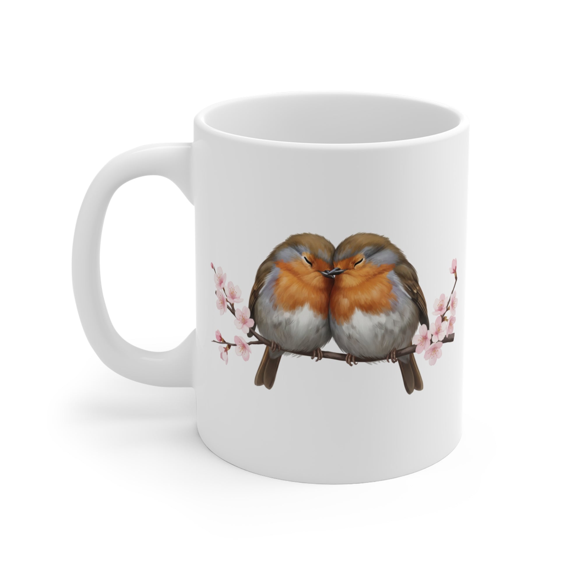 Genieße deinen Kaffee inmitten eines Blütenmeeres. Diese wunderschöne Keramiktasse zeigt ein realistisch gezeichnetes Rotkehlchen-Pärchen, umgeben von zarten, japanischen Kirschblüten. Das Motiv wirkt auf der weißen Tasse wie handgemalt und bringt sofortige Frühlingsstimmung auf den Frühstückstisch. Perfekt als kleine Aufmerksamkeit zum Valentinstag, Muttertag oder einfach als neue Lieblingstasse für Naturliebhaber. Die klassische Tasse ist in den Größen 11 oz. (0,33l) und 15 oz. (0,44l) erhältlich.