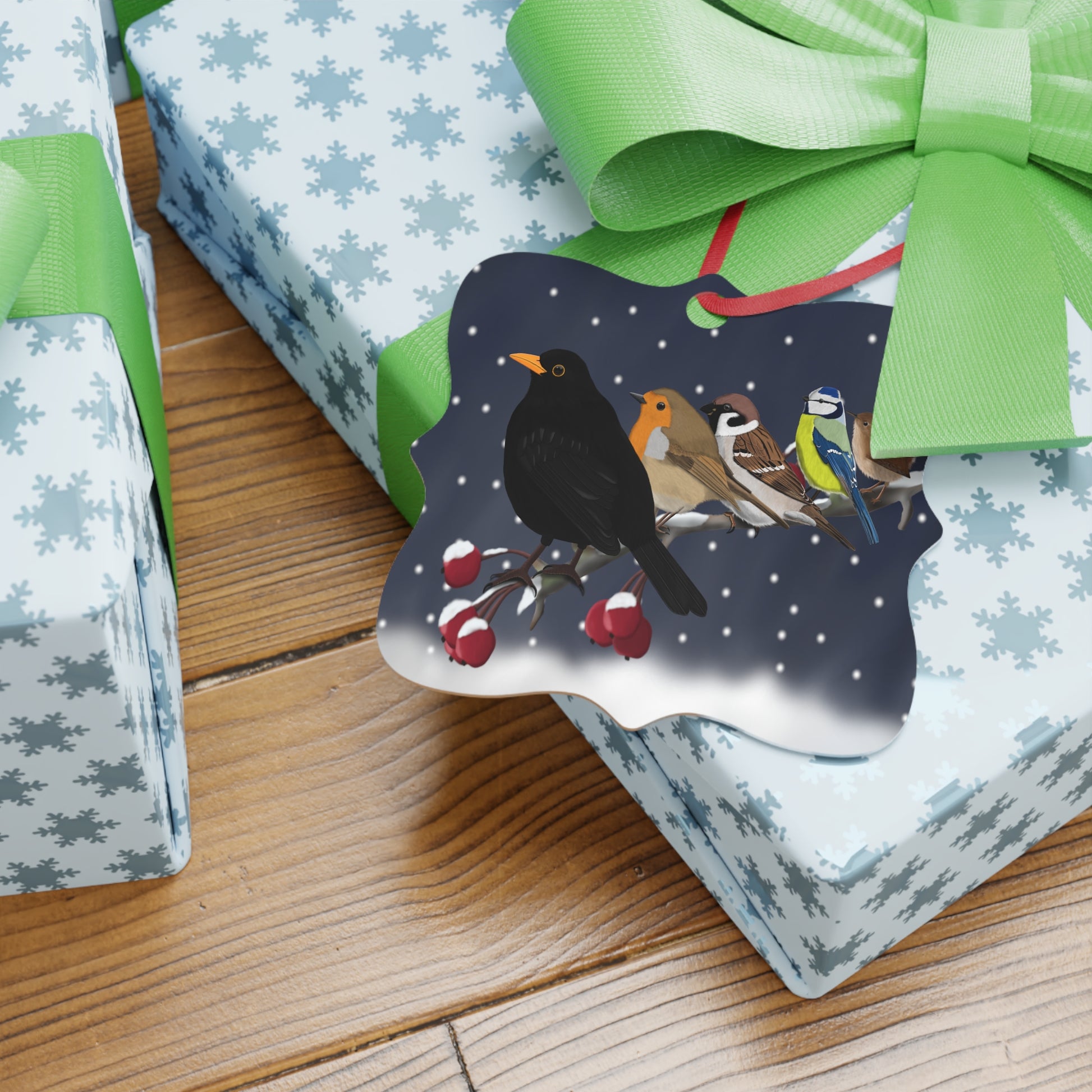 Suchst du nach Weihnachtsbaumschmuck, der aus der Masse heraussticht? Unser Amsel Rotkehlchen Blaumeise auf einem Ast Vogelmotiv Ornament aus hochwertigem Aluminium vereint moderne Eleganz mit der zeitlosen Schönheit unserer heimischen Vögel.