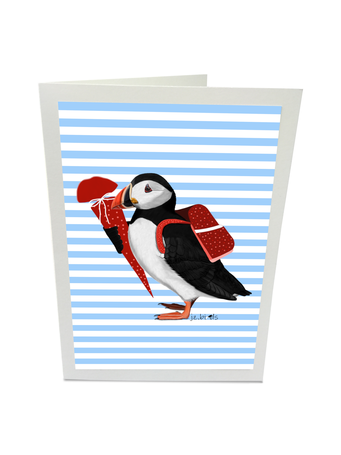 Glückwunschkarte zur Einschulung Papageitaucher Vogelmotiv Blau/Rosa zum Schulanfang mit Umschlag
