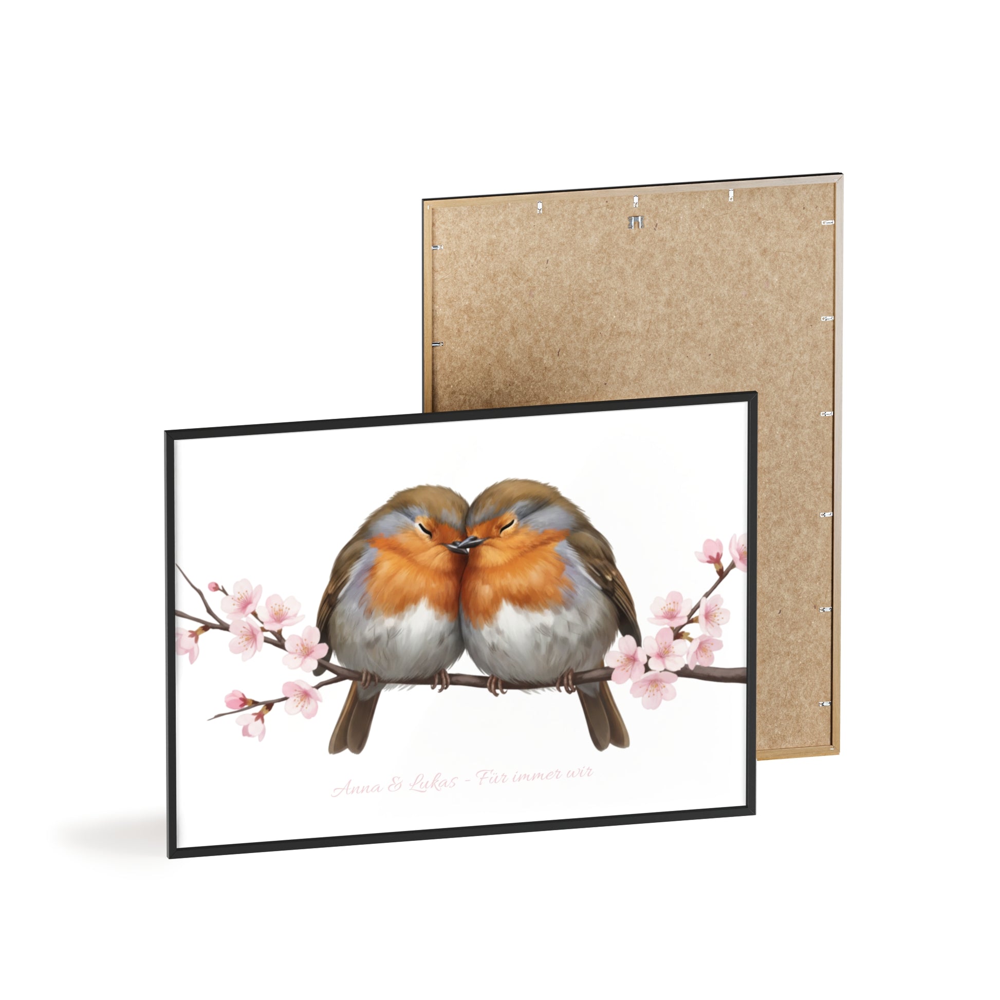 Personalisiertes Wandbild im Holzrahmen – Rotkehlchen-Paar mit Wunschnamen