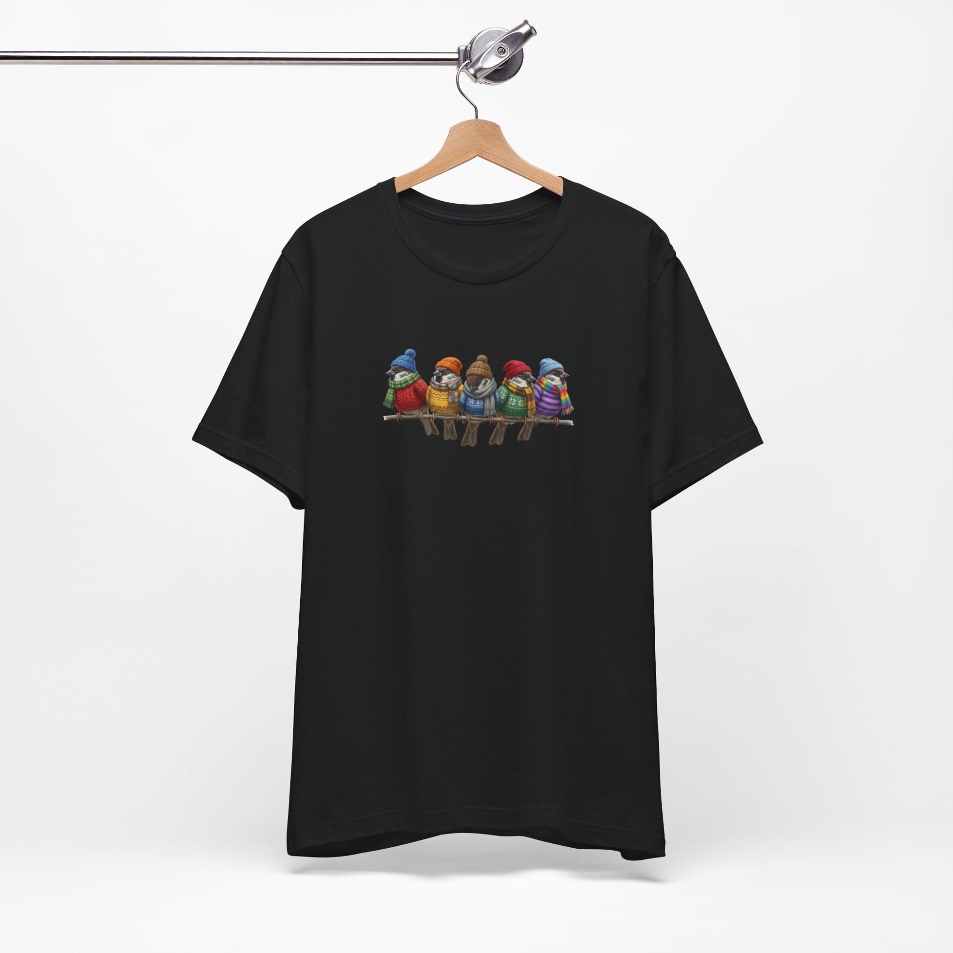 Spatzen in Strick T-Shirt – Weiches Premium Shirt mit Winterlichem Vogelmotiv