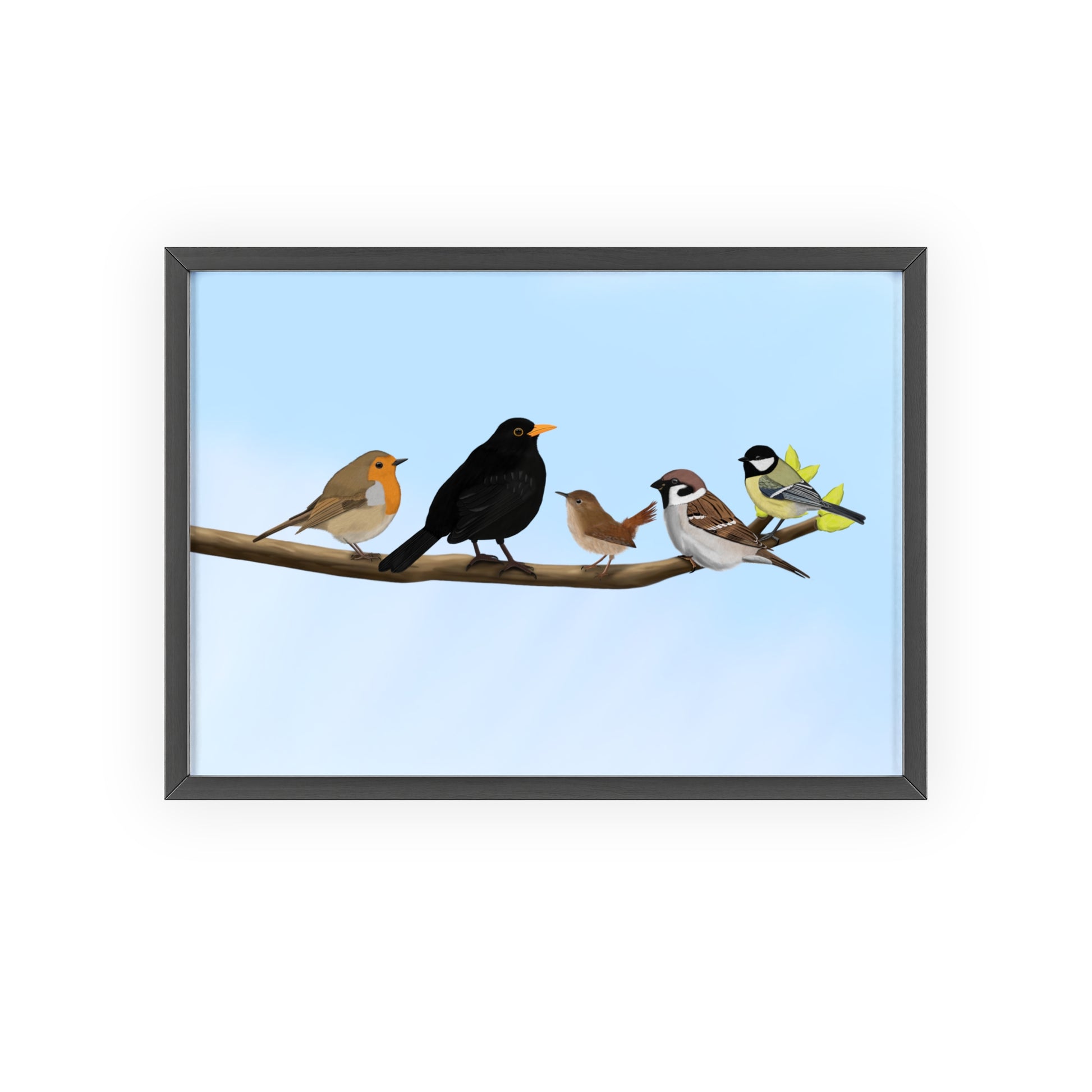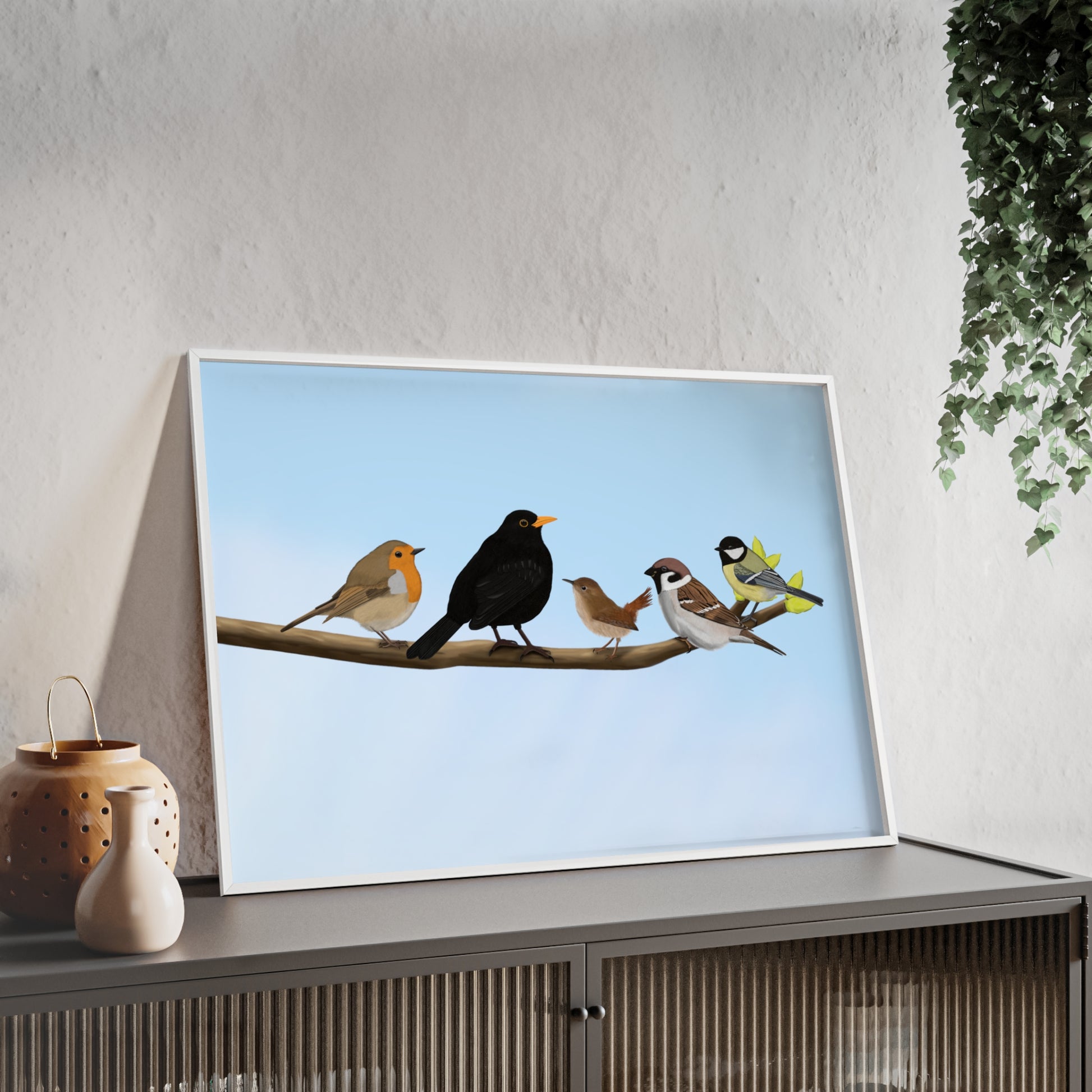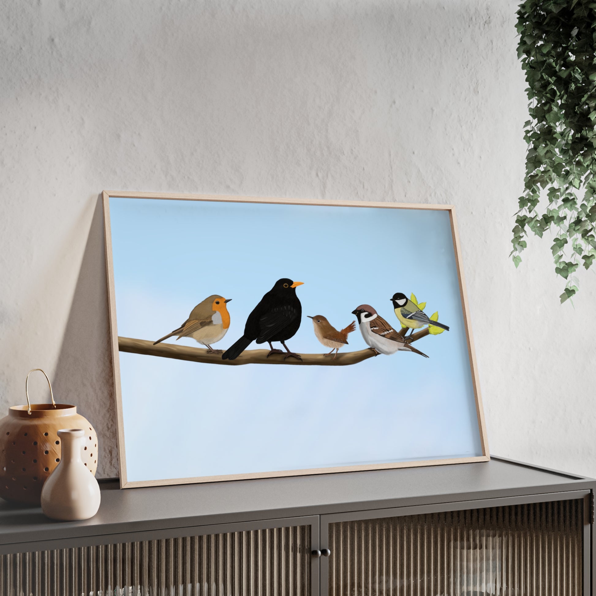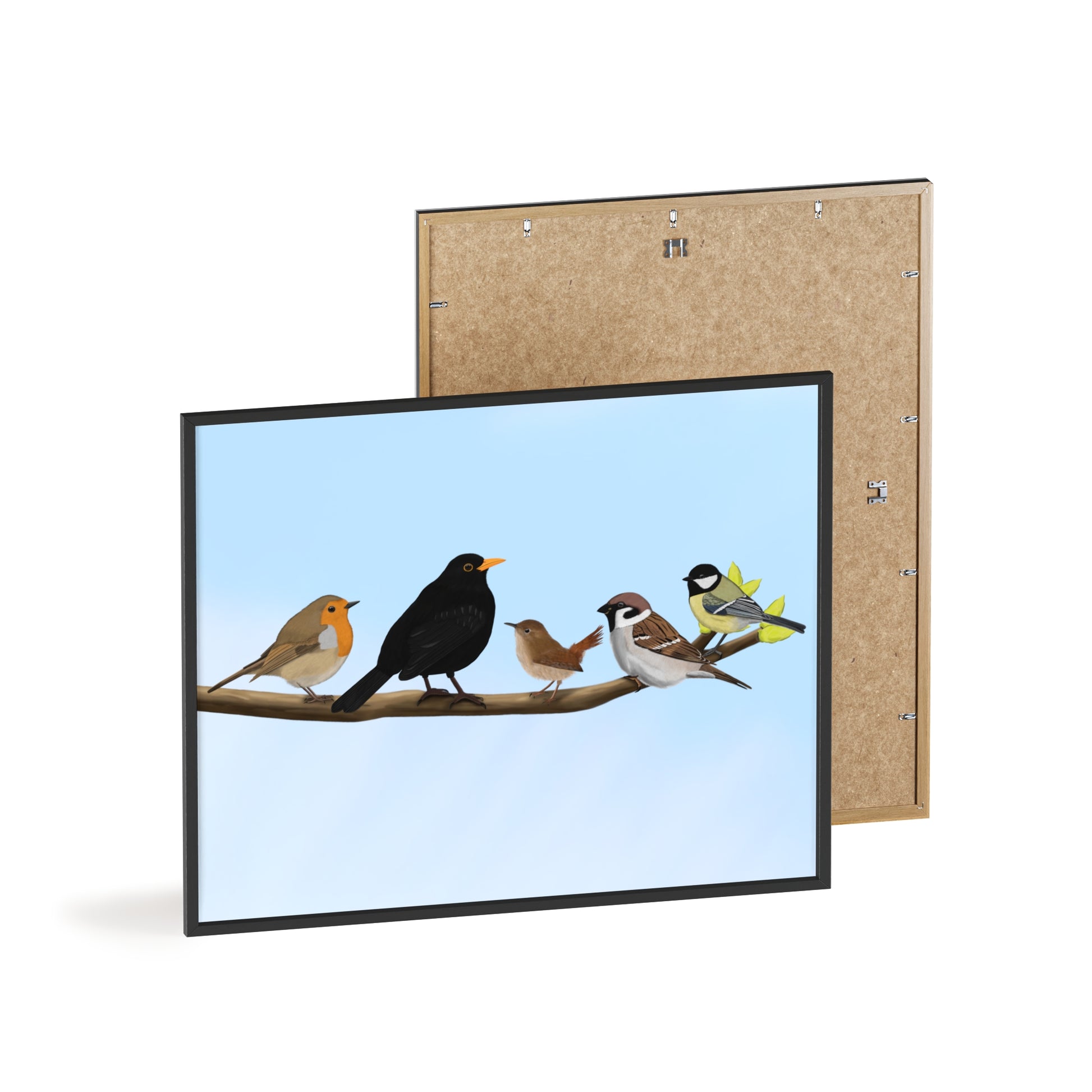 Vogel Poster im Holzrahmen - Vögel auf einem Ast Poster Amsel Rotkehlchen Zaunkönig Spatz Kohlmeise